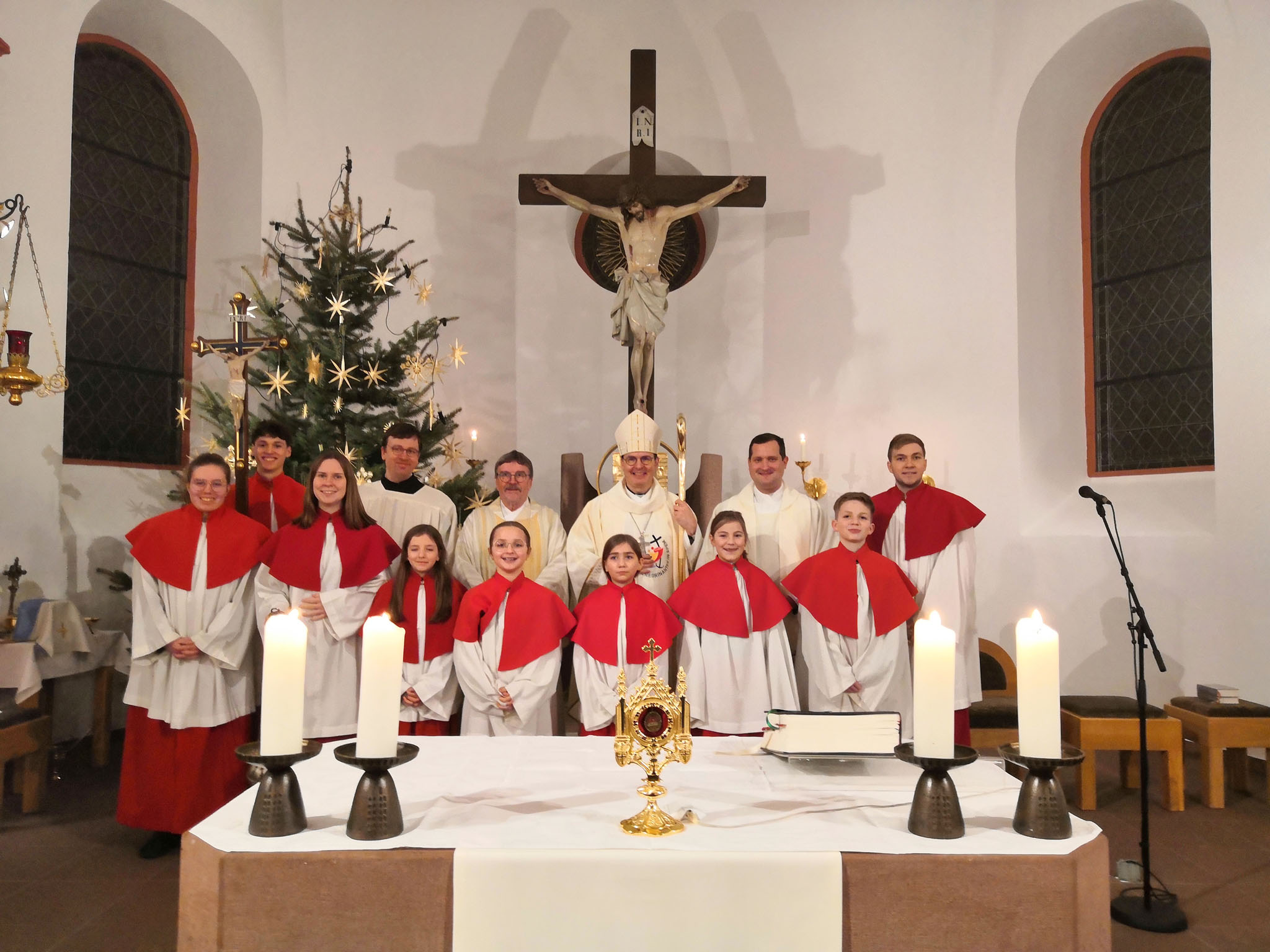Die Eucharistiefeier, in der elf Ministranten aus verschiedenen Ortschaften am Altar dienten, schloss sich an. Konzelebranten waren Vikar Alexander Berger und Diakon Dieter Heßler. Sie wurde musikalisch gestaltet vom Liederkranz Feldkahl, der Feldkahler Blasmusik und Susanne Kuhn an der Orgel. Auf dem Kirchenvorplatz erfreute die Blasmusik die Anwesenden mit einigen schwungvollen Stücken. Im Saal des nahen Sängerheimes kamen die Gäste bei Getränken und Fingerfood mit dem Weihbischof ins Gespräch. Vikar Berger und Weihbischof Reder bedankten sich bei allen, die im Hintergrund für den ansprechenden Rahmen dieser schönen Feier gesorgt haben.